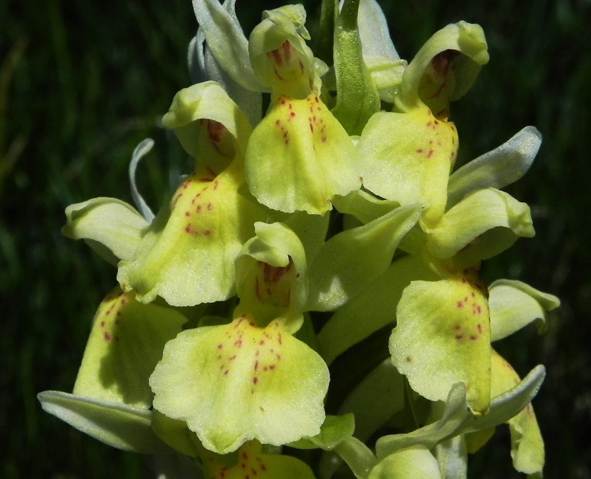 Flores grandes y casi inodoras, purpúreas con manchas amarillas y granates en el labelo (con brácteas purpúreas) o de color amarillo pálido con manchas rojizas en el labelo (con brácteas verdosas). El espolón es grueso y tan largo como el ovario o mas. El labelo ancho y dentado en el borde. La floración es en mayo y junio.